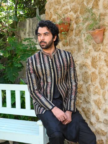 - Elegant Black Multi Embroidered Jacket for Weddings Fabric : Raw Silk Work : Sequin Work Color : Black What You Get : Stitched Black Jacket Only