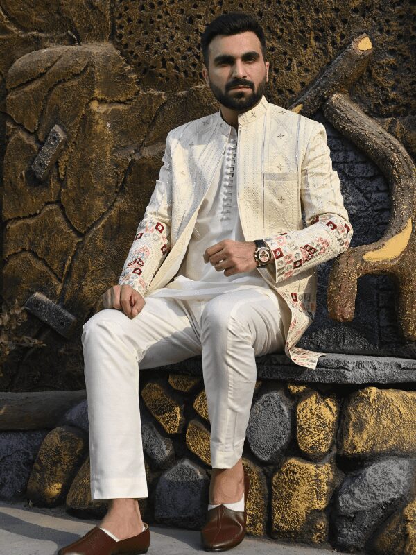 Step into the spotlight of your special day with our Off White Embroidered Front Open Princecoat