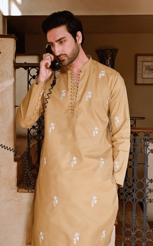 Step into elegance with this Beige Embroidered Kurta Trouser set, designed for men who appreciate refined craftsmanship and timeless fashion. Made from premium fabric, the kurta features delicate embroidery and intricate motifs on the front, collar, and cuffs, adding a sophisticated touch. The matching trouser complements the look, making it perfect for weddings, festive occasions, and cultural celebrations.