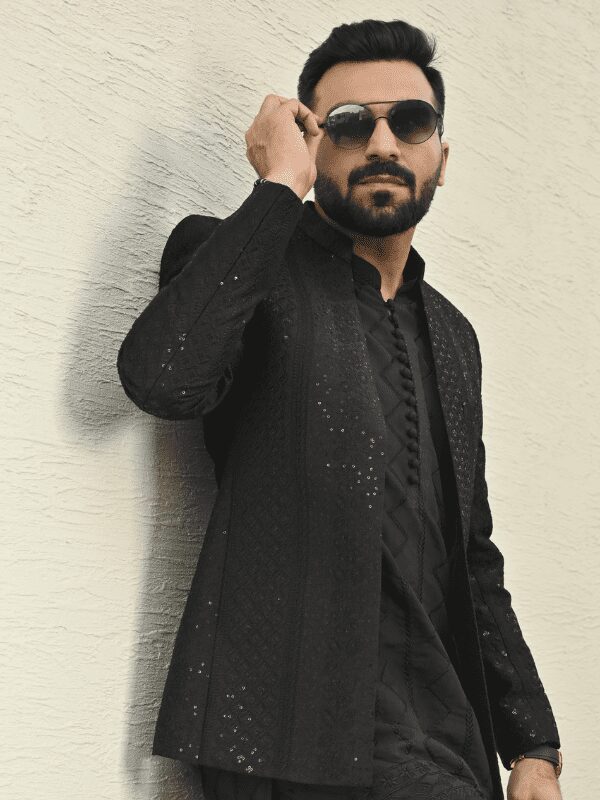 Drape yourself in majestic splendor on your wedding day with our Black Sequence Work Embroidered Princecoat