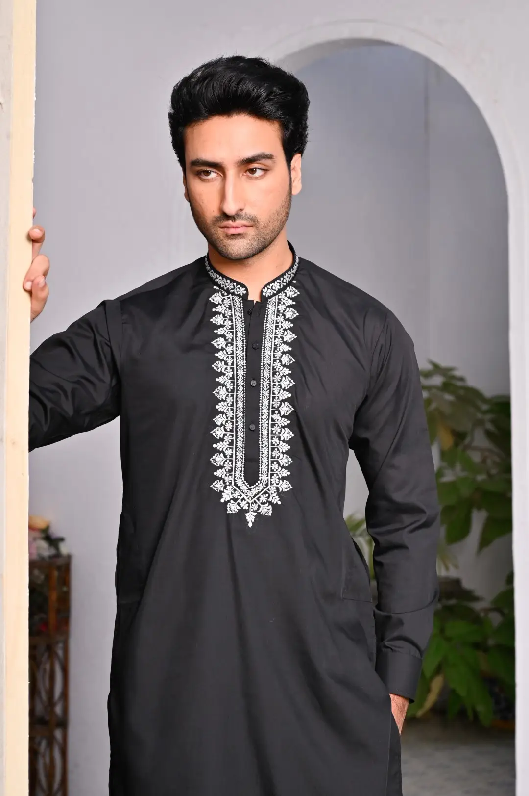 A sleek embroidered kurta with matching trousers, combining elegance and modern style for a perfect formal look.
