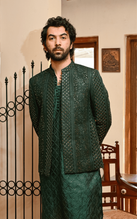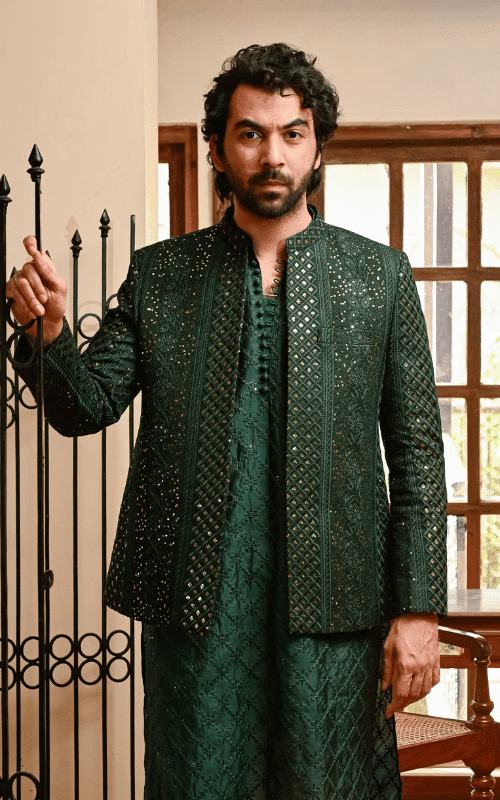 Drape yourself in majestic splendor on your wedding day with our Green Sequence Work Embroidered Princecoat