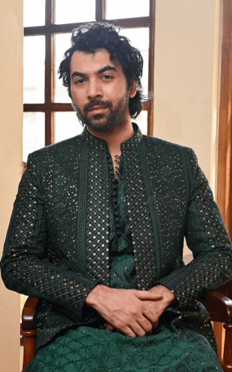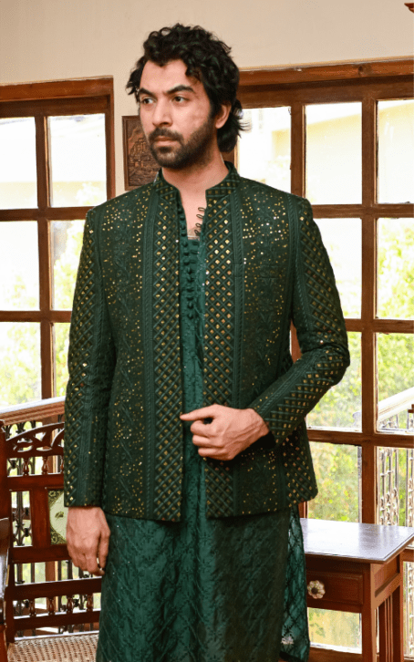 Drape yourself in majestic splendor on your wedding day with our Green Sequence Work Embroidered Princecoat. This resplendent garment is a celebration of opulence and style, adorned with intricate golden sequin work that glistens with every movement. The rich detailing adds a touch of regality, making it a perfect choice for the grandeur of weddings. The golden hue signifies both luxury and timelessness, ensuring you stand out with an air of unmatched elegance. Elevate your wedding ensemble with this princecoat, a harmonious blend of traditional craftsmanship and contemporary allure, promising a truly memorable and enchanting celebration.