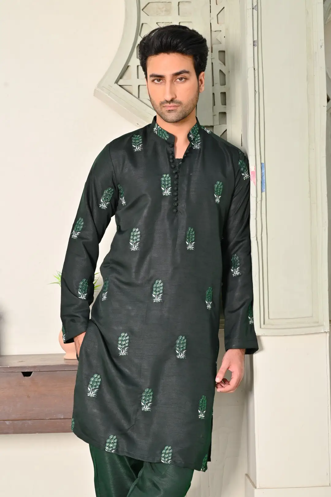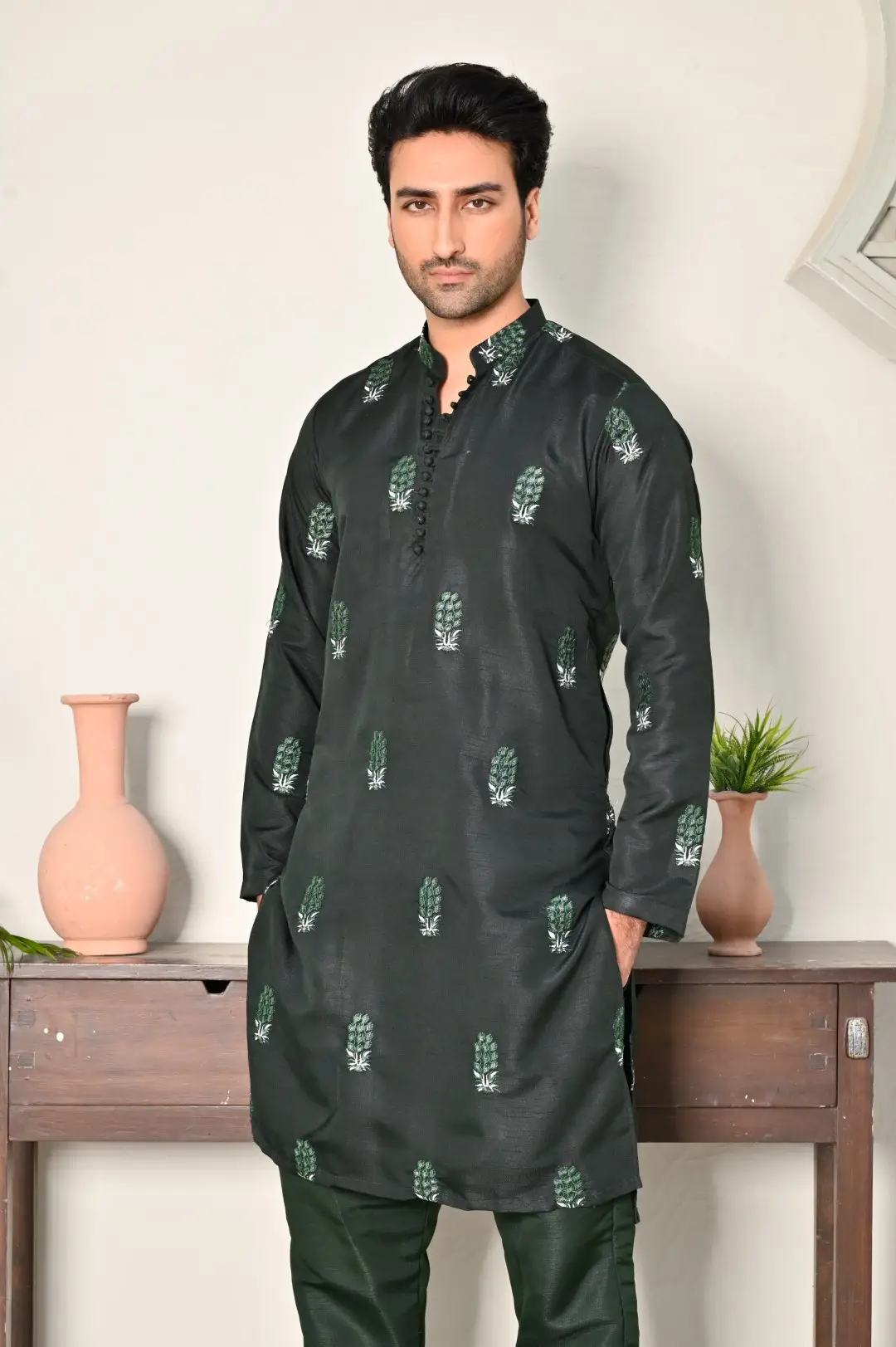 A sleek embroidered kurta with matching trousers, combining elegance and modern style for a perfect formal look.