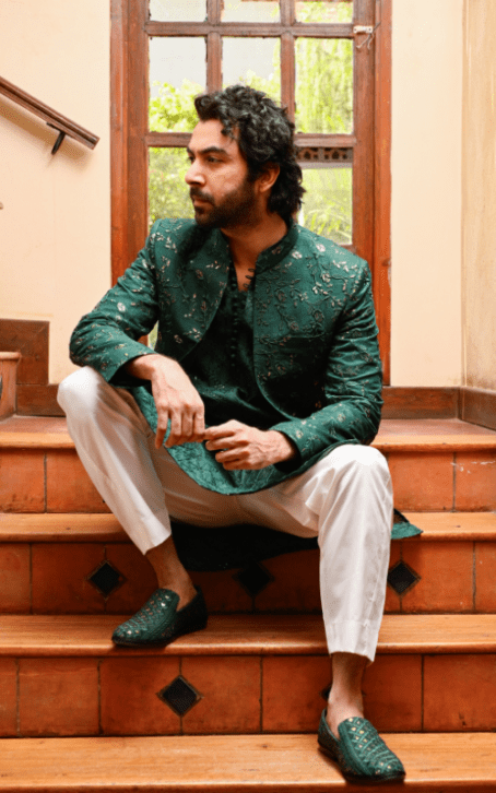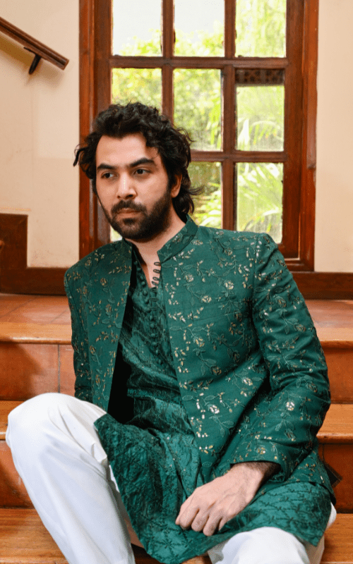 Emerald Green Self-Embroidered Prince Coat – A Regal Blend of Tradition & Sophistication