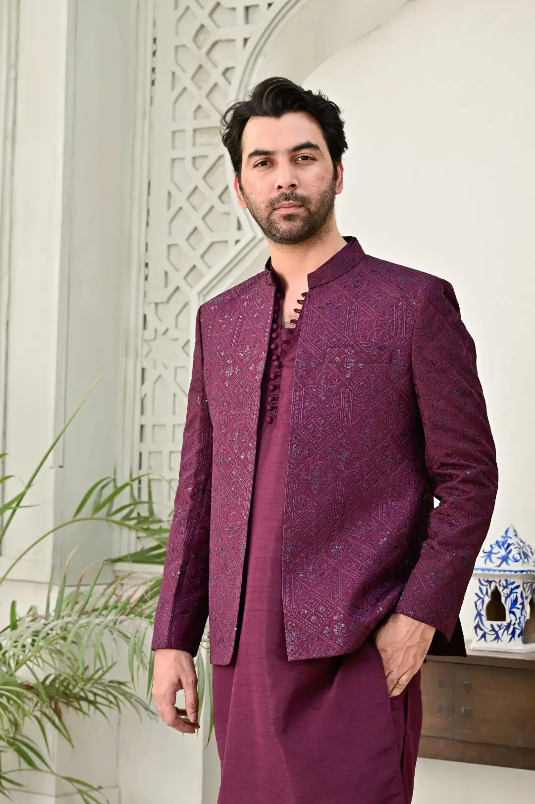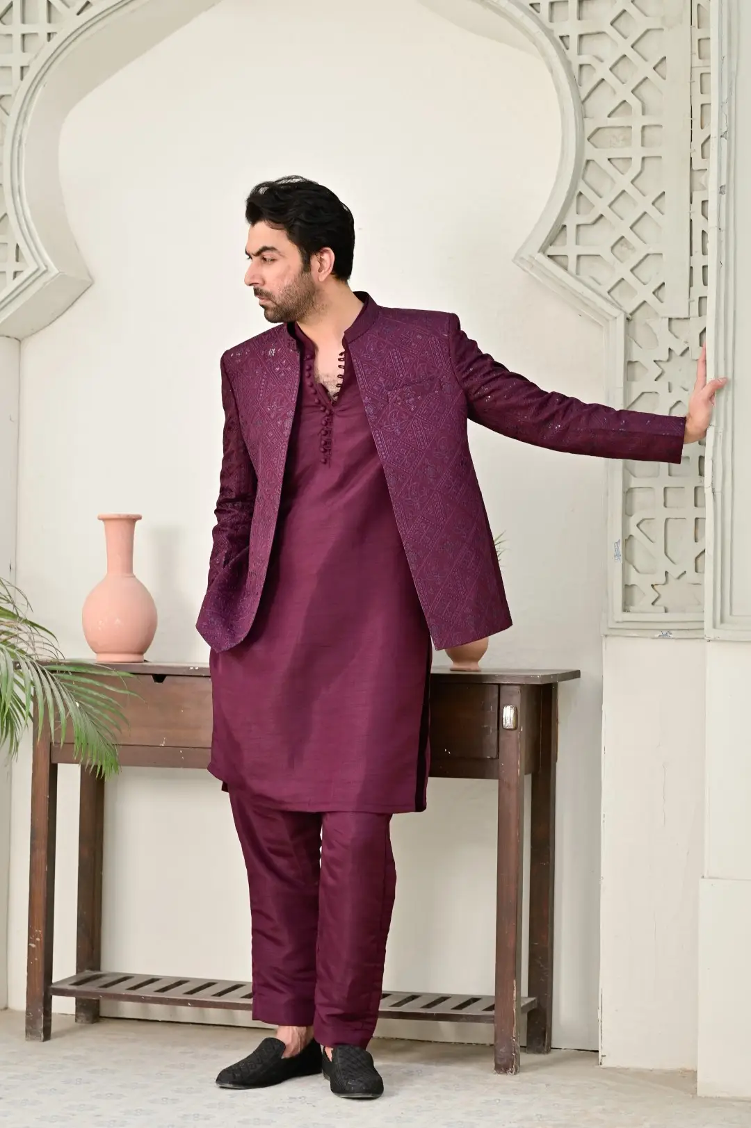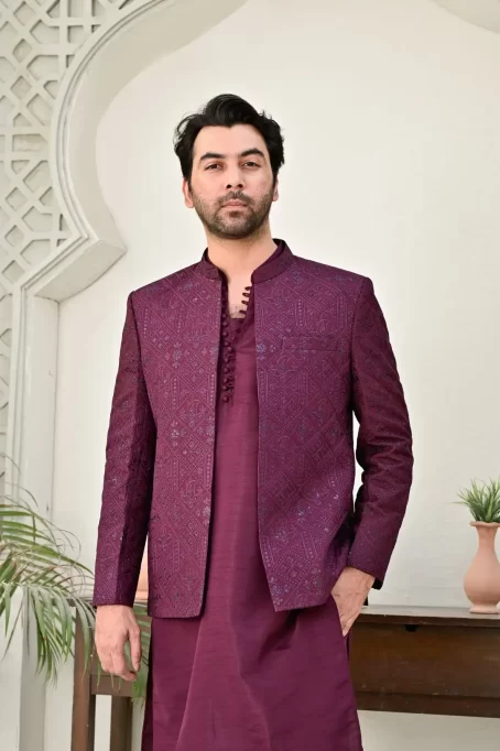 The Burgundy Embroidered Wedding Coat is the epitome of sophistication and style for grooms and wedding attendees alike. Its sleek black silhouette exudes timeless elegance, while intricate embroidery adorns the coat, adding a touch of regal opulence. This coat makes a bold fashion statement, making it a perfect choice for weddings, receptions, and formal events.