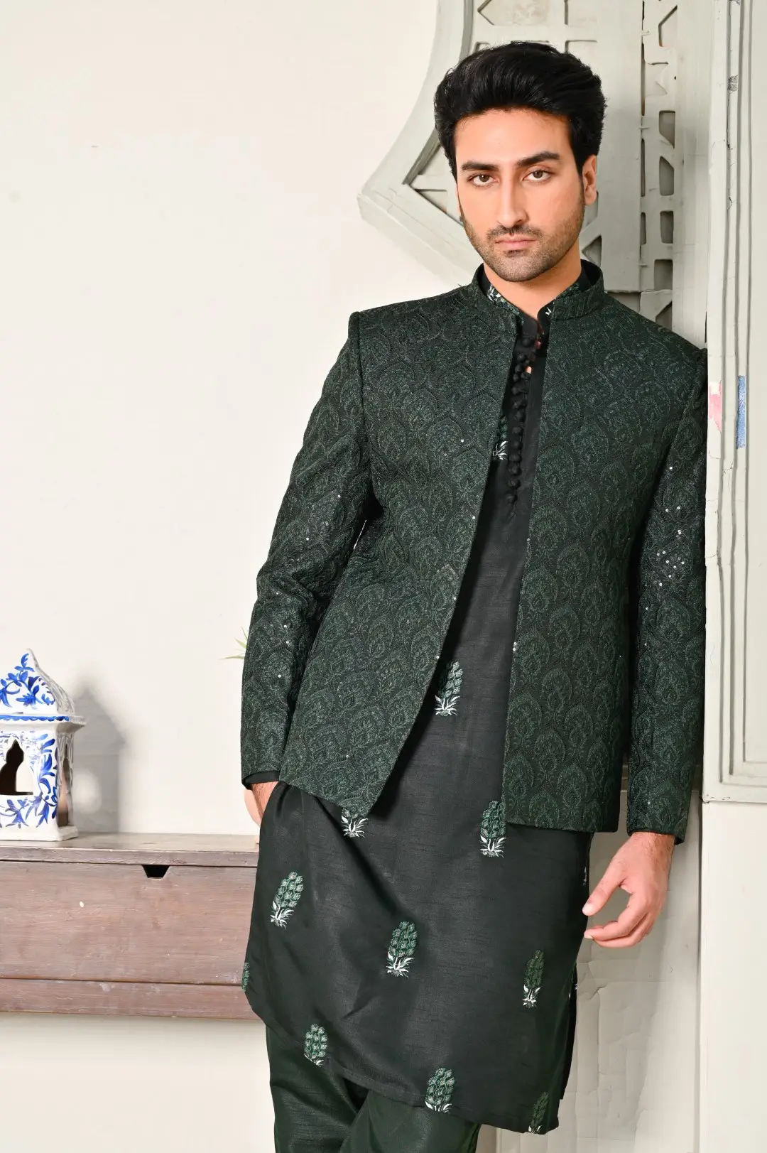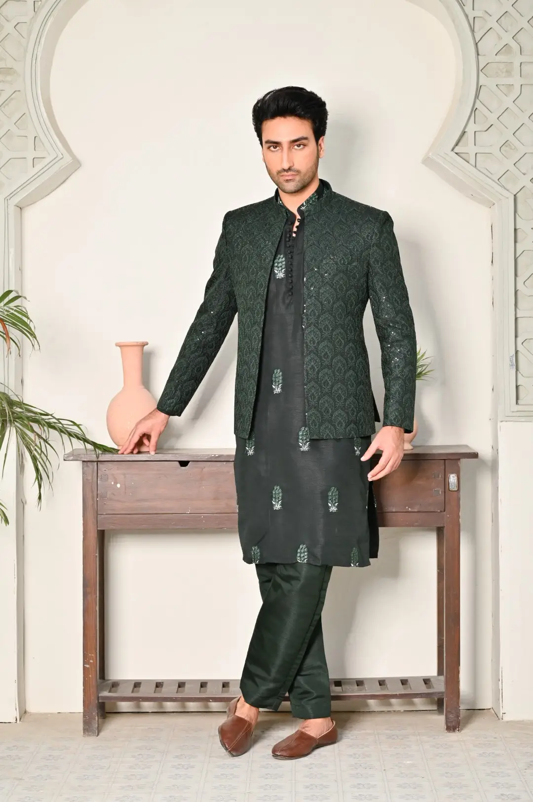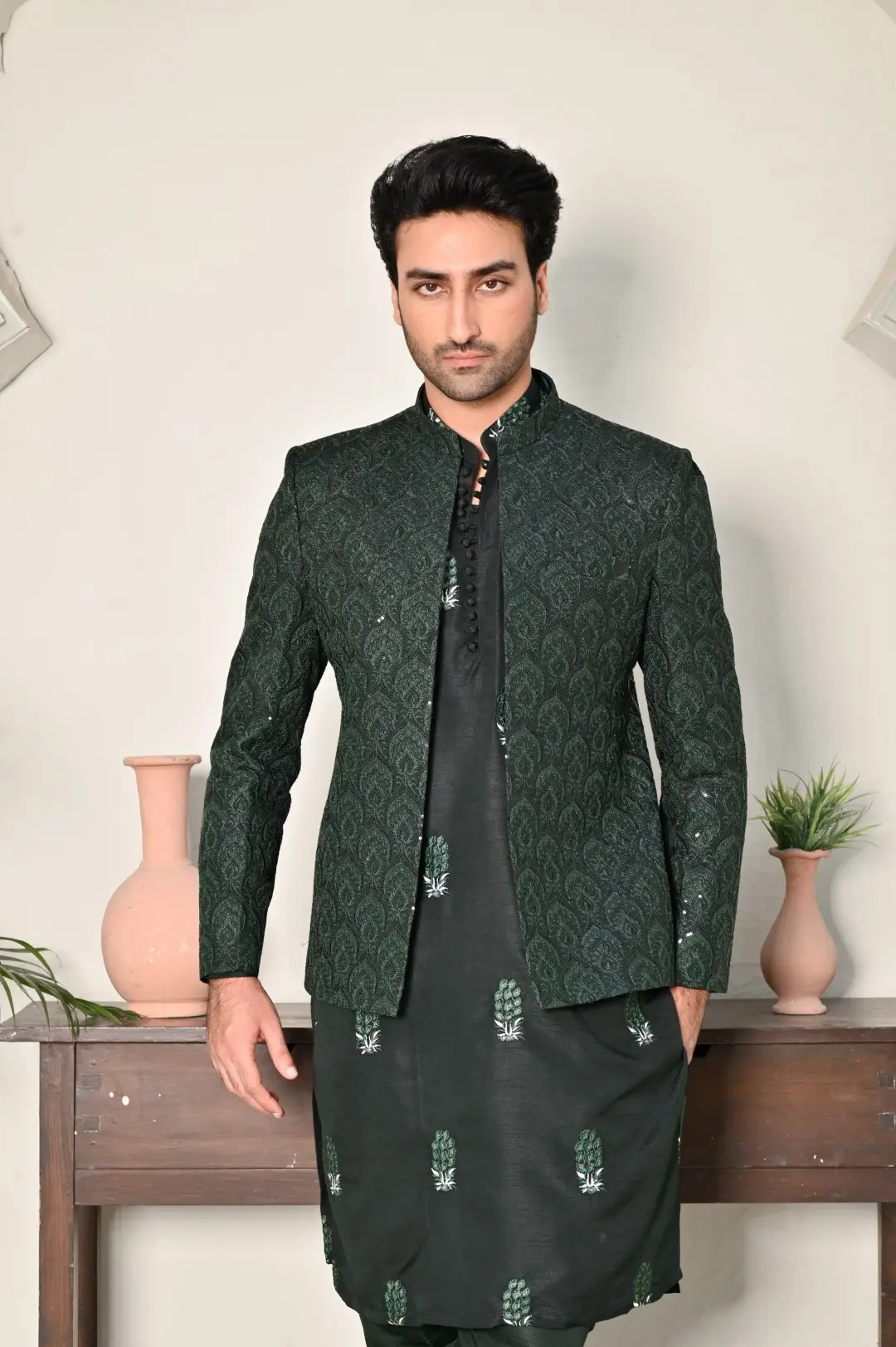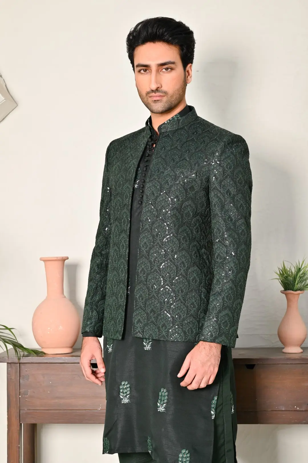 The Emerald Green Embroidered Wedding Coat is the epitome of sophistication and style for grooms and wedding attendees alike. Its sleek black silhouette exudes timeless elegance, while intricate embroidery adorns the coat, adding a touch of regal opulence. This coat makes a bold fashion statement, making it a perfect choice for weddings, receptions, and formal events.