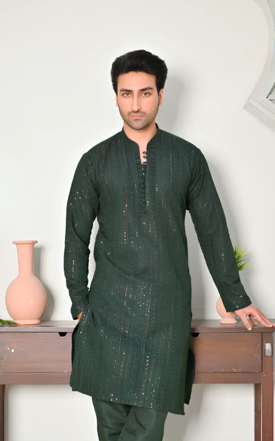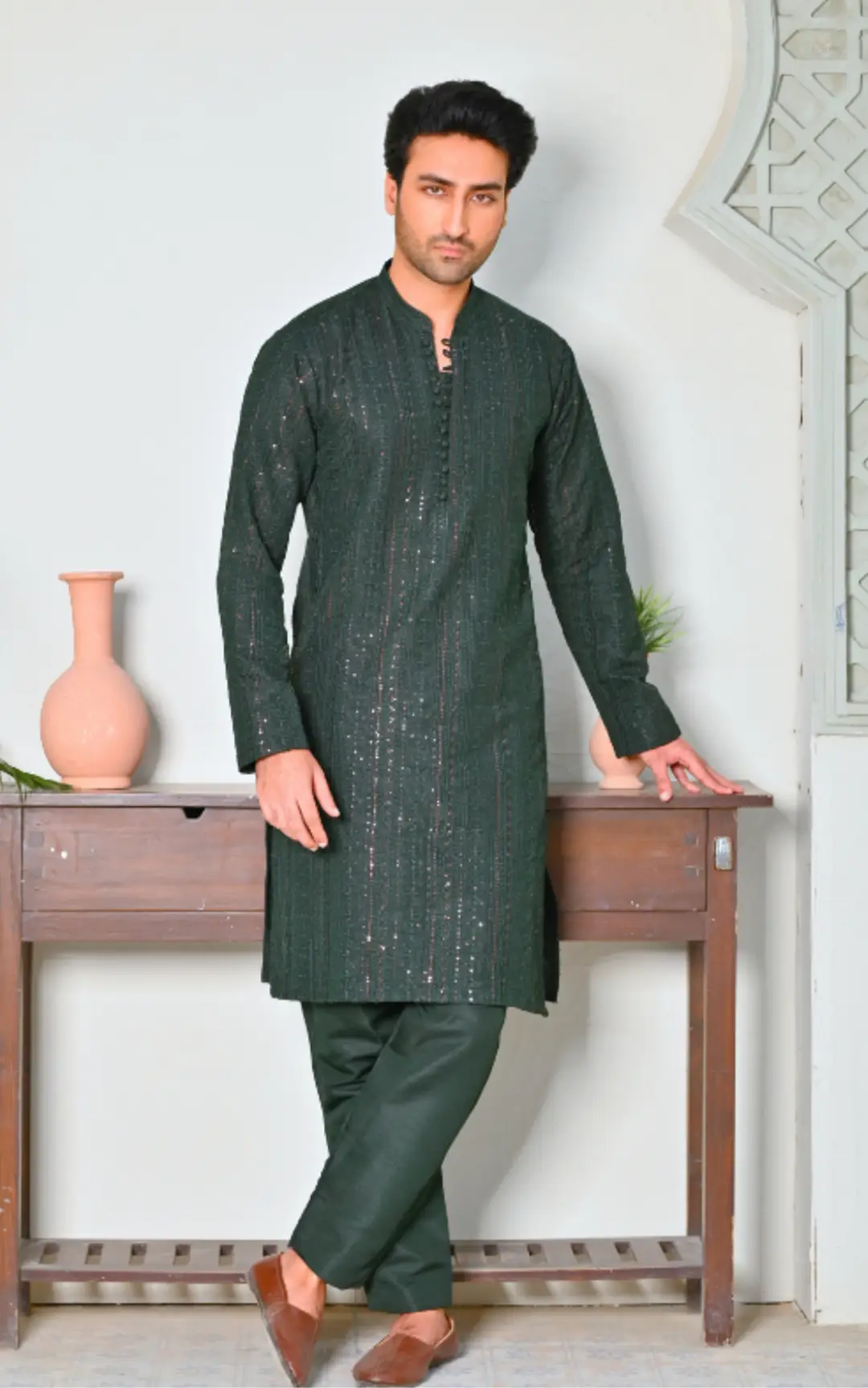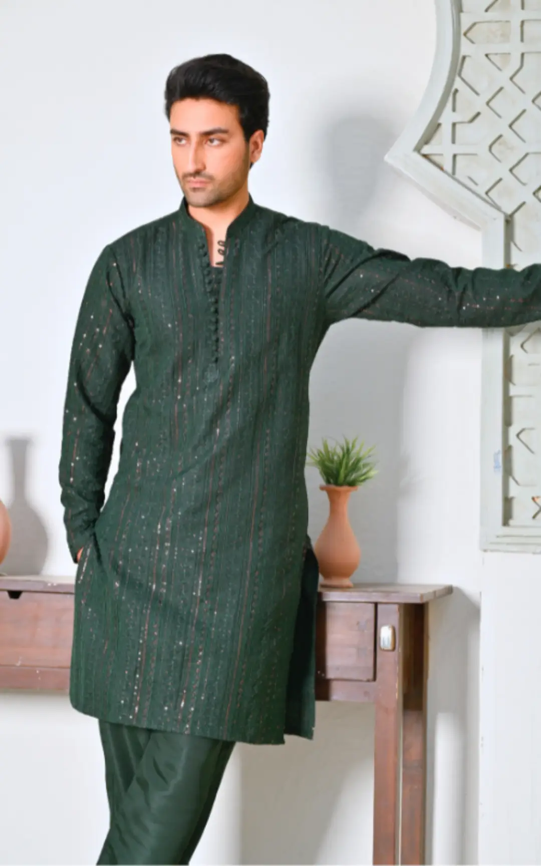 A sleek embroidered kurta with matching trousers, combining elegance and modern style for a perfect formal look.