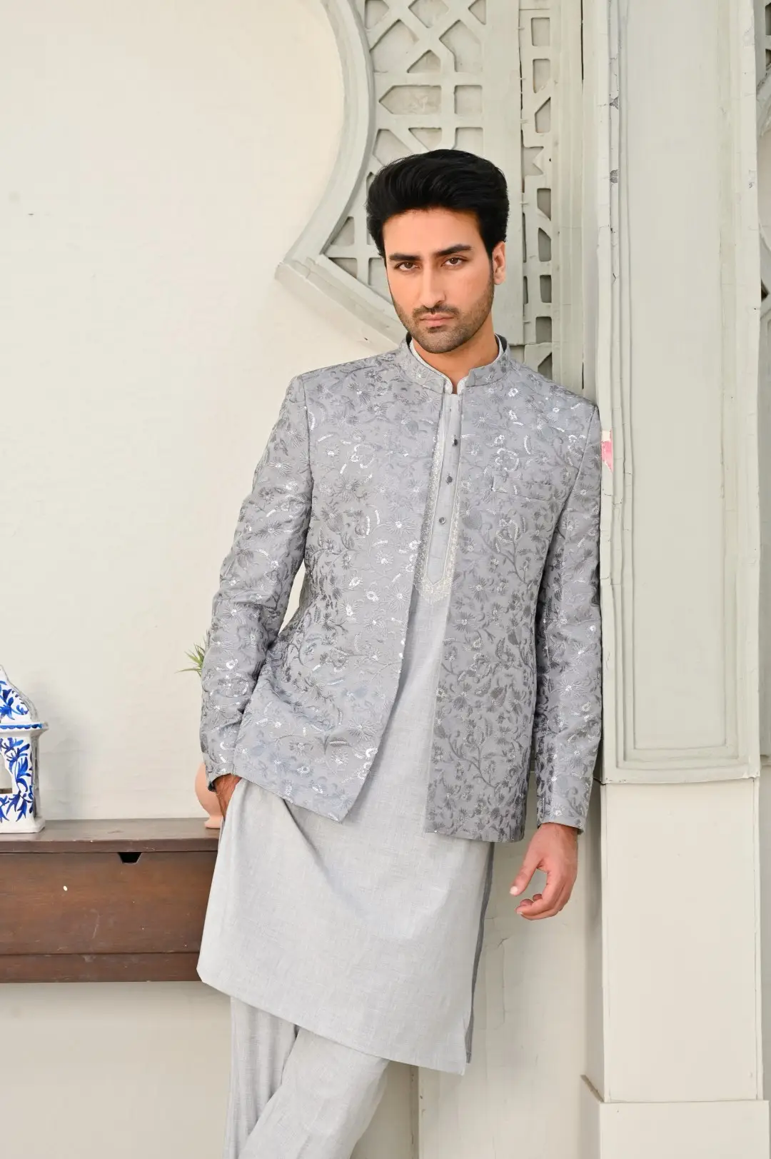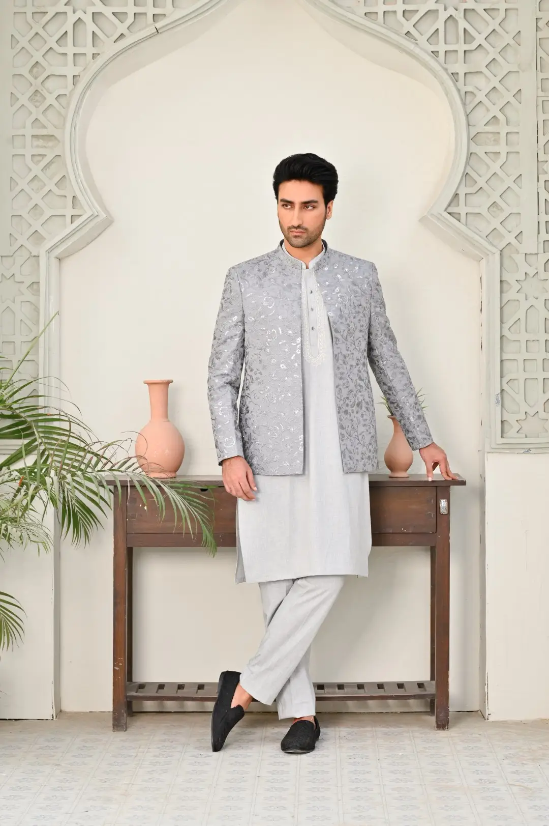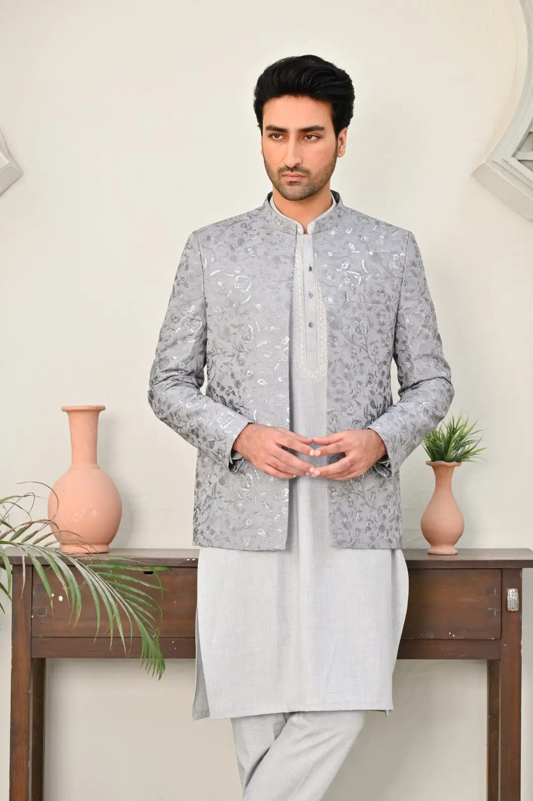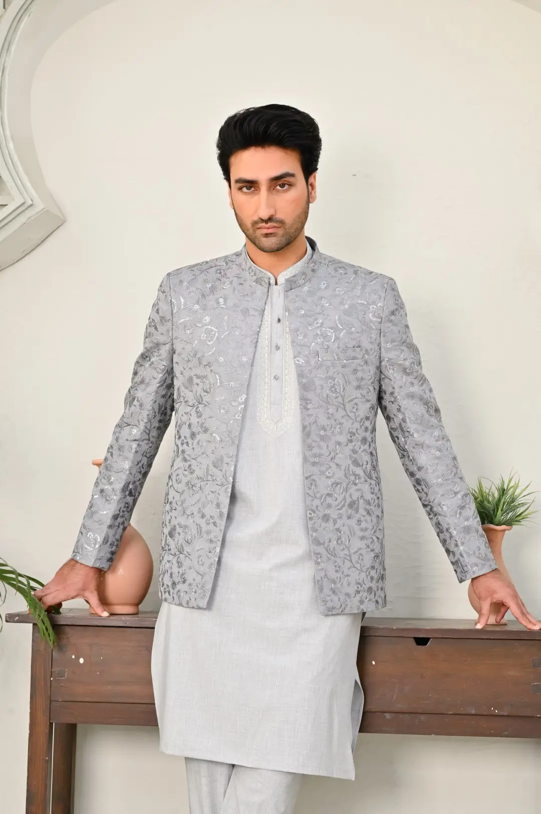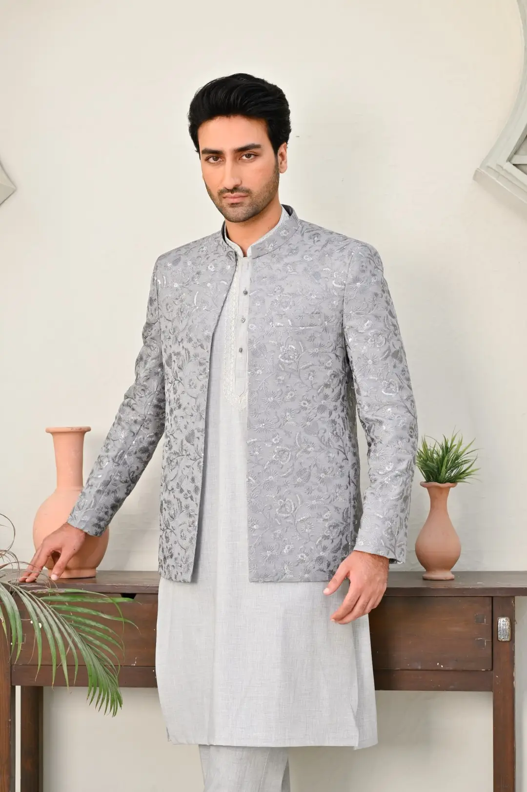 The Grey Embroidered Wedding Coat is the epitome of sophistication and style for grooms and wedding attendees alike. Its sleek black silhouette exudes timeless elegance, while intricate embroidery adorns the coat, adding a touch of regal opulence. This coat makes a bold fashion statement, making it a perfect choice for weddings, receptions, and formal events.