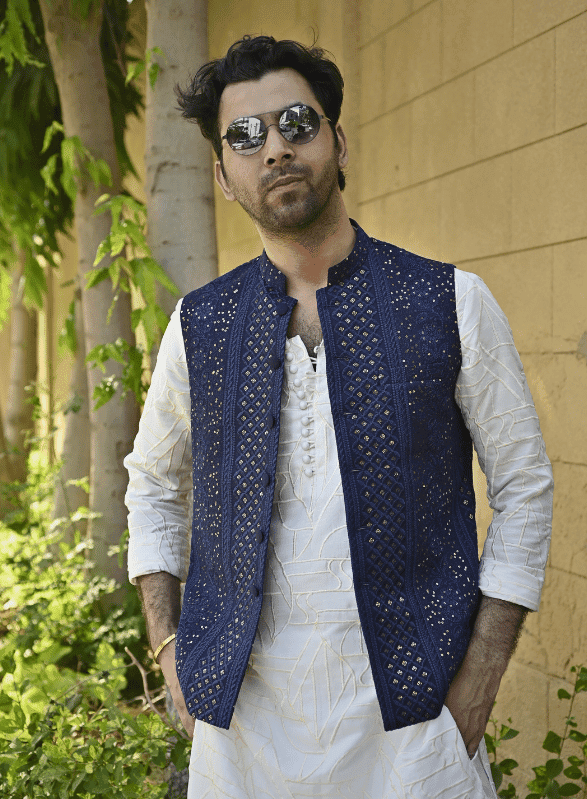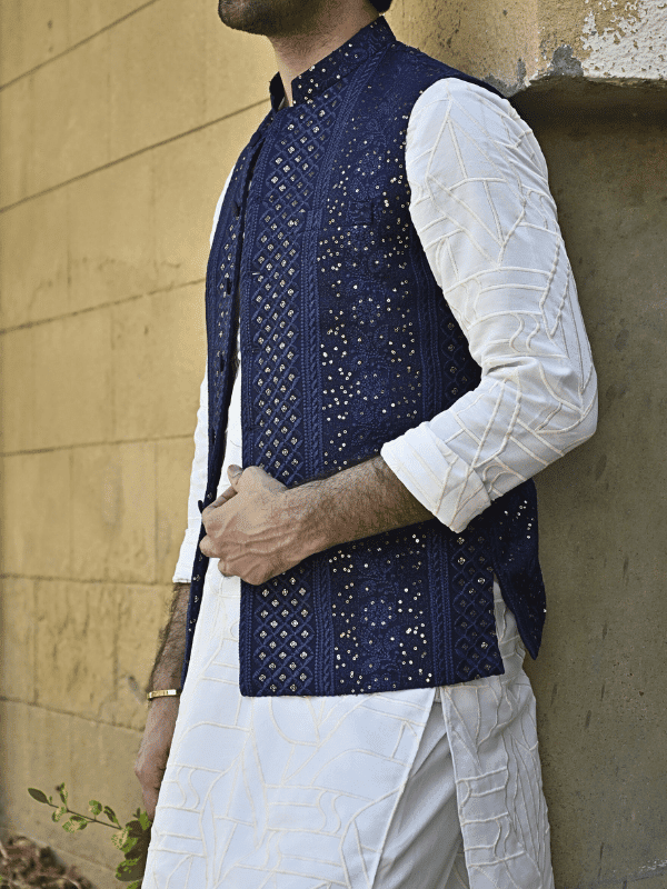 Make a bold statement with the Navy Multi Embroidered Sequins Waistcoat. This sophisticated piece features a deep navy hue adorned with vibrant, multi-colored embroidery and sparkling sequins. Its glamorous design adds a touch of elegance and sparkle to any outfit, making it a perfect choice for special occasions.