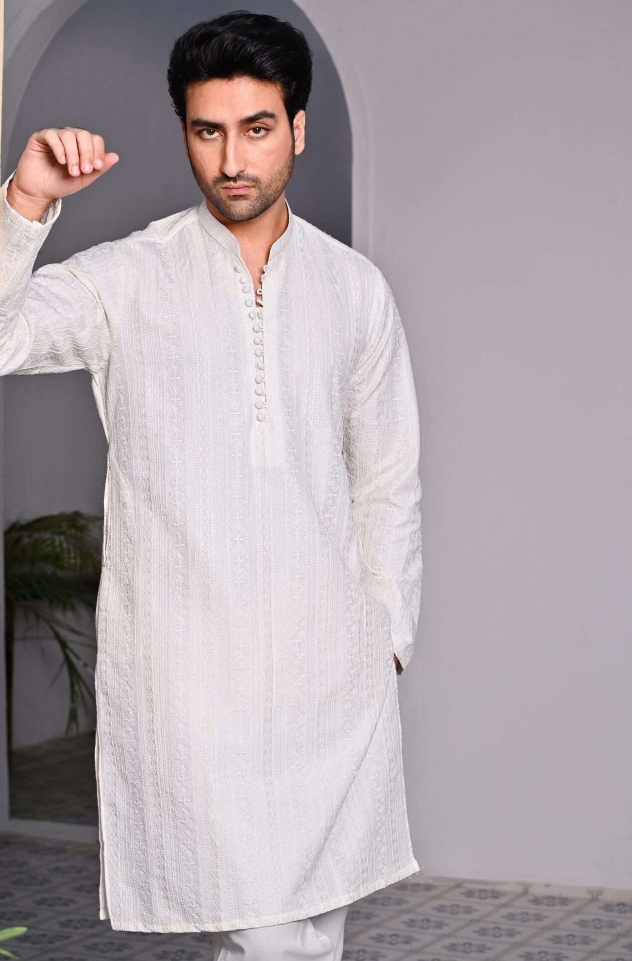 This off-white kurta trouser set features tone-on-tone resham embroidery, creating a rich, refined look that speaks of effortless luxury. Perfect for those who believe beauty lies in details.