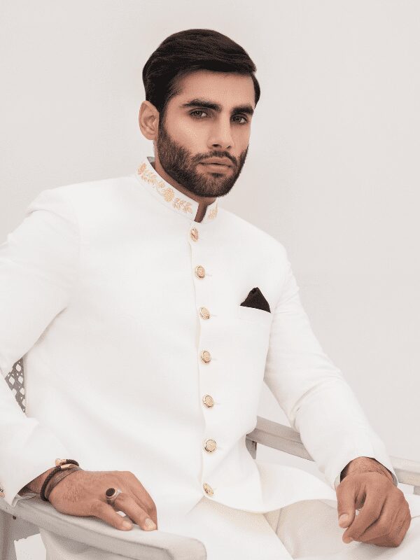 An Off-White Embroidered Wedding Sherwani epitomizes timeless elegance for grooms on their special day. This regal garment features a refined off-white hue, symbolizing purity and sophistication. Adorned with intricate embroidery, the Sherwani boasts traditional motifs and luxurious detailing, creating a majestic ensemble that captures the essence of cultural opulence and celebration. Perfectly tailored, it is a distinctive choice for those seeking a harmonious blend of tradition and style.