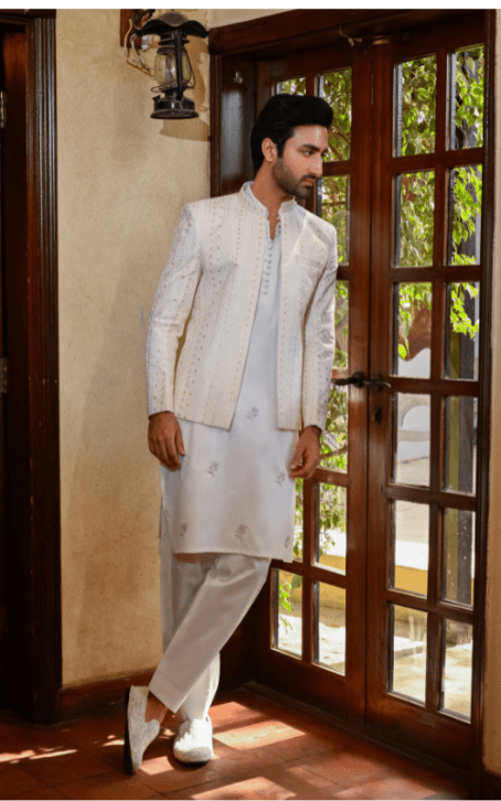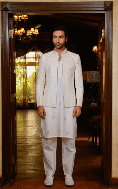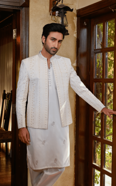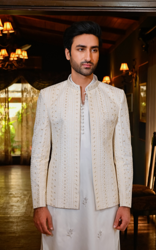 Step into timeless sophistication with this Off White Self-Embroidered Prince Coat—where tradition meets modern elegance! ✨
