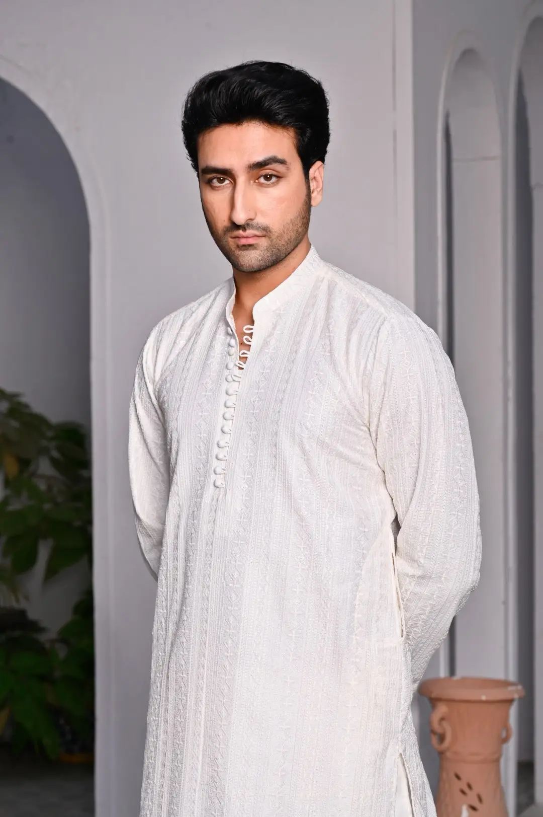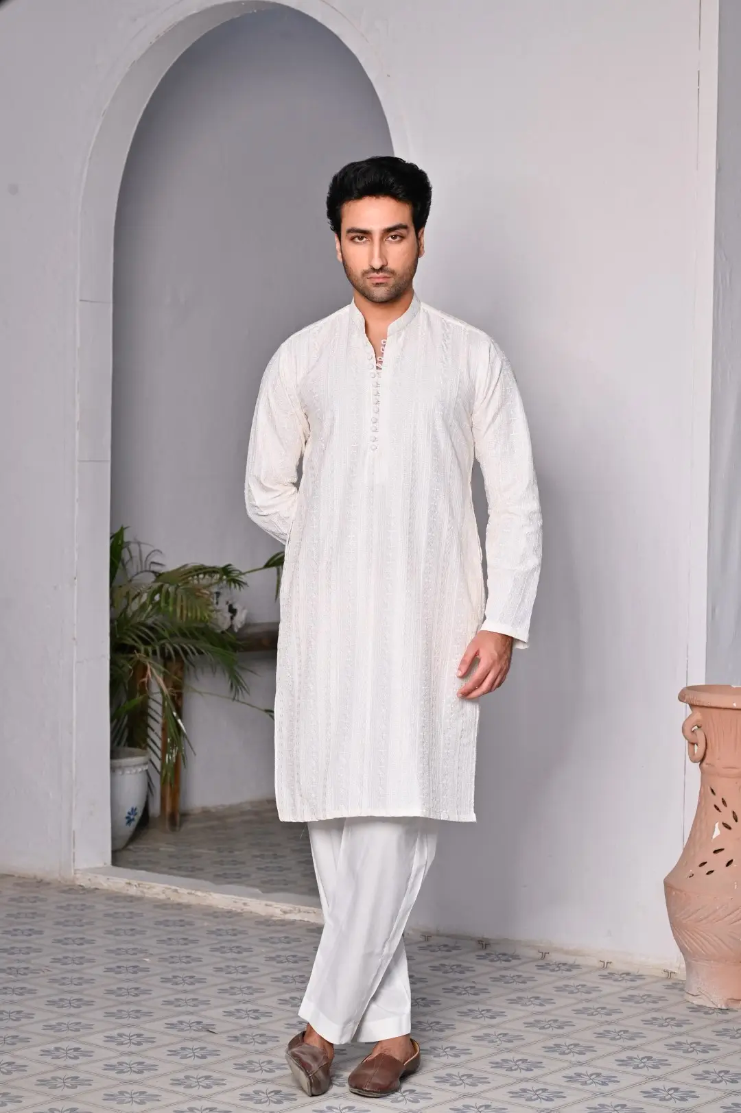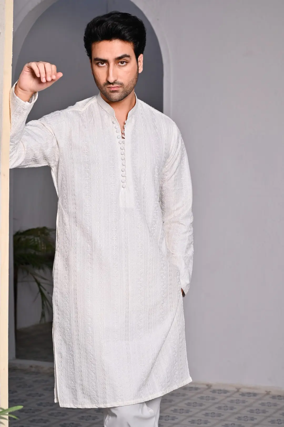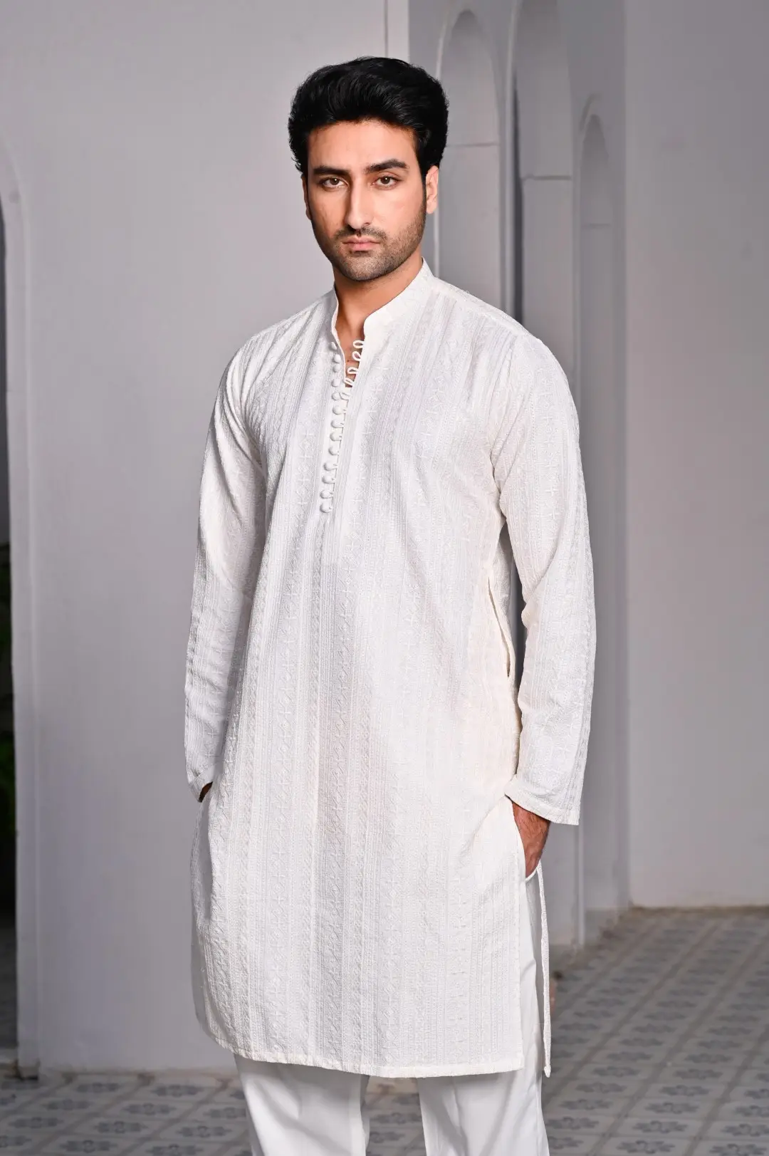 A sleek embroidered kurta with matching trousers, combining elegance and modern style for a perfect formal look.