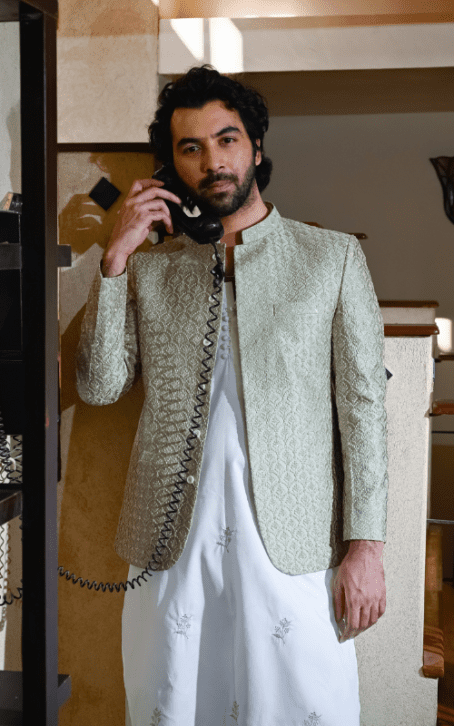Sage Green Self-Embroidered Prince Coat – A Refined Statement of Elegance