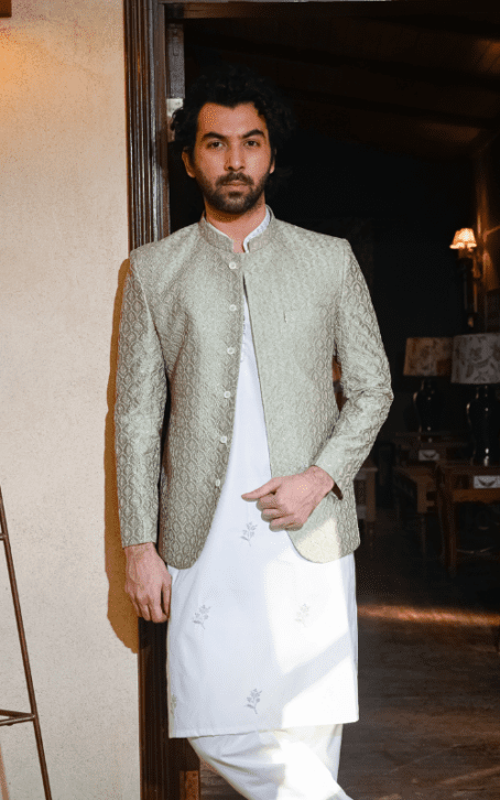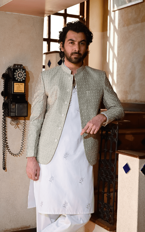 Make a lasting impression with this Sage Green Self-Embroidered Prince Coat, crafted for men who appreciate understated luxury. Designed from premium fabric, this coat features intricate self-embroidery, adding texture and sophistication to its regal silhouette. The soothing sage green hue offers a contemporary yet timeless charm, making it an ideal choice for weddings, receptions, and grand celebrations.