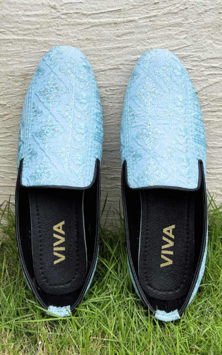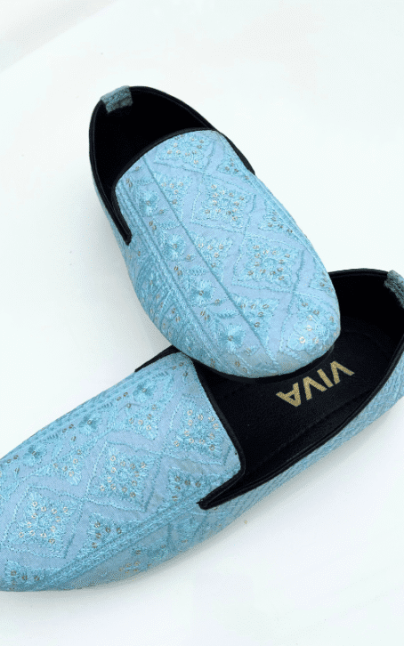 Step into timeless elegance with these exquisite sky blue wedding shoes, intricately embroidered and adorned with delicate sequin work. Designed for the modern groom who values tradition, these shoes perfectly complement Mehndi, Barat, and Nikkah ensembles. The rich craftsmanship and comfortable fit make them an ideal choice for adding regal charm to your special day.